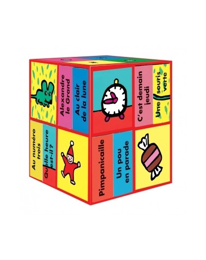 C'est à la fois un cube magique et une première bibliothèque. C'est une boîte à secrets une boîte à tiroirs dont chacun recèle une comptine. Il y a Alexandre le Grand Henri Quatre la souris verte le pou en parade la poule sur son mur Au clair de la lune...douze petites histoires illustrées avec tendresse et malice.
