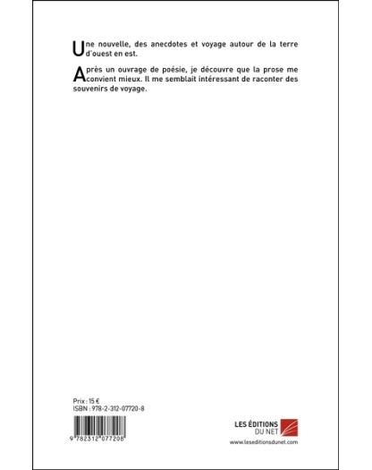 Résumé : Une nouvelle des anecdotes et voyage autour de la terre d’ouest en est. Auteur(s) : Après un ouvrage de poésie je découvre que la prose me convient mieux. Il me semblait intéressant de raconter des souvenirs de voyage.