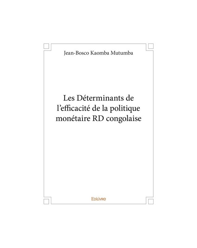 EAN : 9782414370016 - Auteur : Jean-Bosco Kaomba Mutumba - Editeur : EDILIVRE - Nb de pages : 152 - Dans le présent ouvrage axé sur l'efficacité des déterminants de la politique monétaire congola...