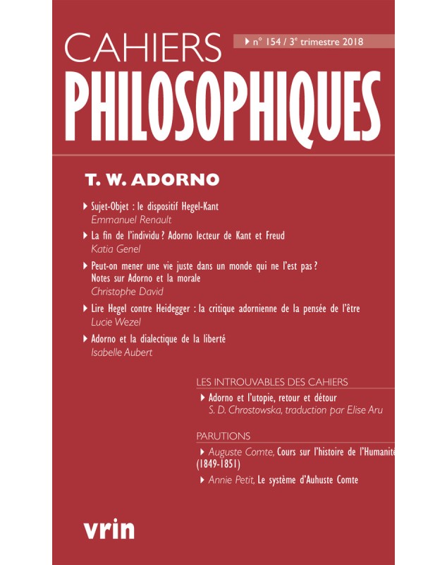 Ce numéro consacré à Theodor W.Adorno donne un aperçu précis de sa démarche philosophique de la manière dont il trace progressivement la voie de la dialectique négative par le jeu de lectures critiques qui s’étayent les unes les autres. Lors d’une discussion avec Horkheimer à l’époque de la rédaction de La dialectique de la raison Adorno affirmait : « une négation déterminée de la position hégélienne serait l’optimum d’une vérité théorique telle que je peux me la représenter ».Pour élaborer une dialectique matérialiste sans synthèse ni perspective d’une fin de l’histoire une lecture fine et pugnace de Hegel est nécessaire : contre le dépassement dialectique de la scission du sujet et de l’objet il faut ainsi maintenir le primat de l’objet ce qu’une reprise critique de la « chose en soi » permet de faire. Kant Nietzsche Marx aussi bien que Freud sont lus et mis à contribution pour parvenir à délivrer la dialectique de son essence affirmative et réussir à viser la concrétude sans la dissocier artificiellement des rapports sociaux et des conflits qui s’y déploient. L’interprétation divergente du concept hégélien d’expérience par Heidegger et Adorno manifeste leur opposition inconciliable et le choix affirmé contre la pensée de l’être d’une métaphysique renouvelée.