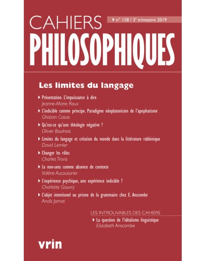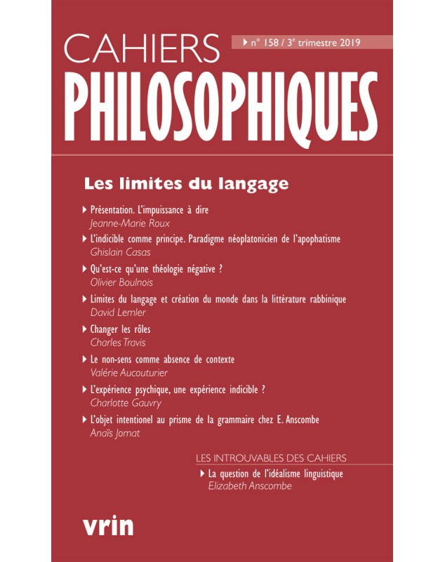 Quel sens y a-t-il à parler des « limites du langage » dès lors qu’on reconnaît qu’il est impossible de circonscrire a priori ce qui peut être dit par un locuteur dans une langue donnée? L’expérience d’une impossibilité de parler ou de dire certaines choses est pourtant ordinaire. Mais c’est plus encore la possibilité de produire des énoncés dénués de sens de croire dire quelque chose et de n’en rien faire qui manifeste les contraintes grammaticales inhérentes à nos différents usages du langage.Les articles de ce numéro s’inscrivent dans le sillage des analyses de Wittgenstein et explorent sous divers angles le vaste domaine de « ce qui ne peut être dit ».À cet ensemble s’ajoute la traduction inédite d’un texte d’Elizabeth Anscombe intitulé « La question de l’idéalisme linguistique ».