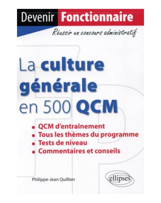 Pour qui ? L’ouvrage est destiné aux candidats des concours de catégorie C et B comportant une épreuve de QCM ou d’entretien avec le jury.Devenir fonctionnaire ! L’ouvrage présente 500 QCM de culture générale sur les principaux thèmes abordés dans les concours.Comment ? Les QCM propos