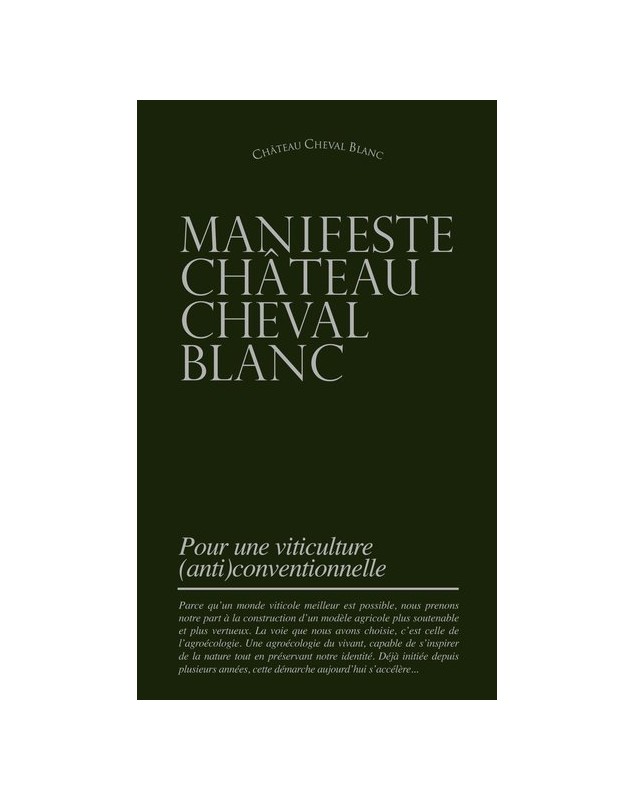 Alors que le changement climatique et l'effondrement de la biodiversité sont au cœur des préoccupations de chacun le Château Cheval Blanc s'engage dans la voie de l'agroécologie en s'appuyant sut trois piliers :- l'agroforesterie ;- les couverts végataux ;- la polyculture.Ce manifeste révè