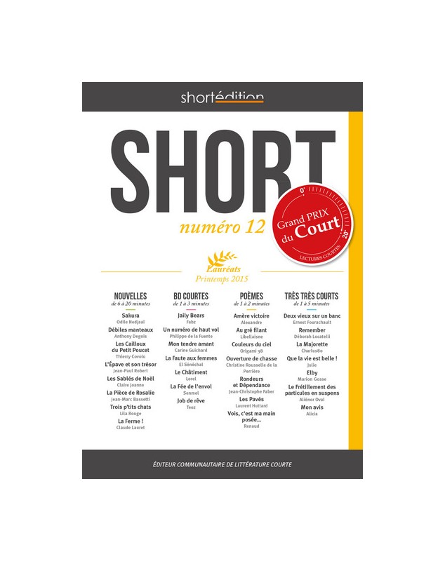 SHORT c’est chaque saison le recueil du meilleur du court : des Nouvelles des BD courtes des Poèmes (de l’alexandrin au slam) des Très Très Courts pour des lectures de 1 à 20 minutes.C’est le plaisir de la lecture courte. D’un seul trait !Retrouvez dans ce numéro 12 tous les Lauréats d