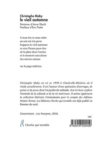 EAN : 9782918220459 - Auteur : Mahy - Editeur : HERBE TREMBLE - Nb de pages : 0 - Dans la suite de poèmes du « Vieil Automne » c’est la vie qui se déploie de murmures en murmur...
