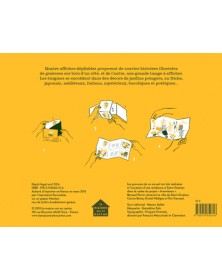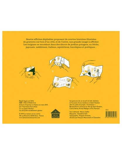 Quatre affiches dépliables (63 x 34 cm) proposent de courtes histoires illustrées de gravures sur bois d’un côté et de l’autre une grande image à afficher. Les énigmes se succèdent dans des décors de jardins potagers en friche japonais médiévaux italiens mystérieux bucoliques et poét
